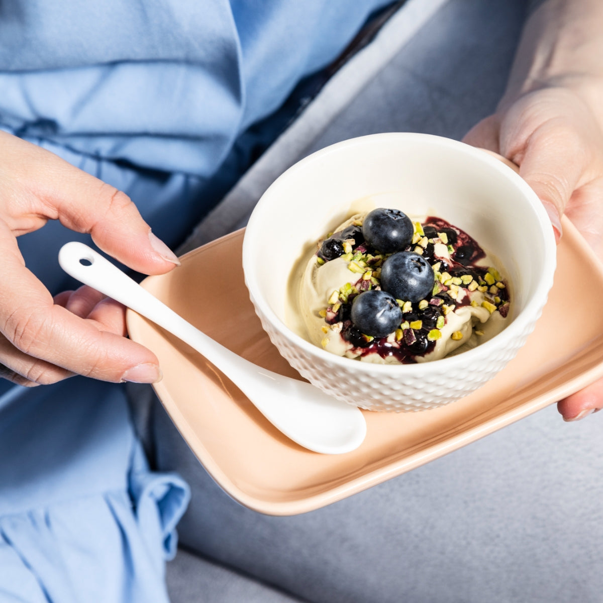 Gusta un delizioso Gelato Pistacchio abbinato a granella di pistacchi e mirtilli selvatici semicanditi.